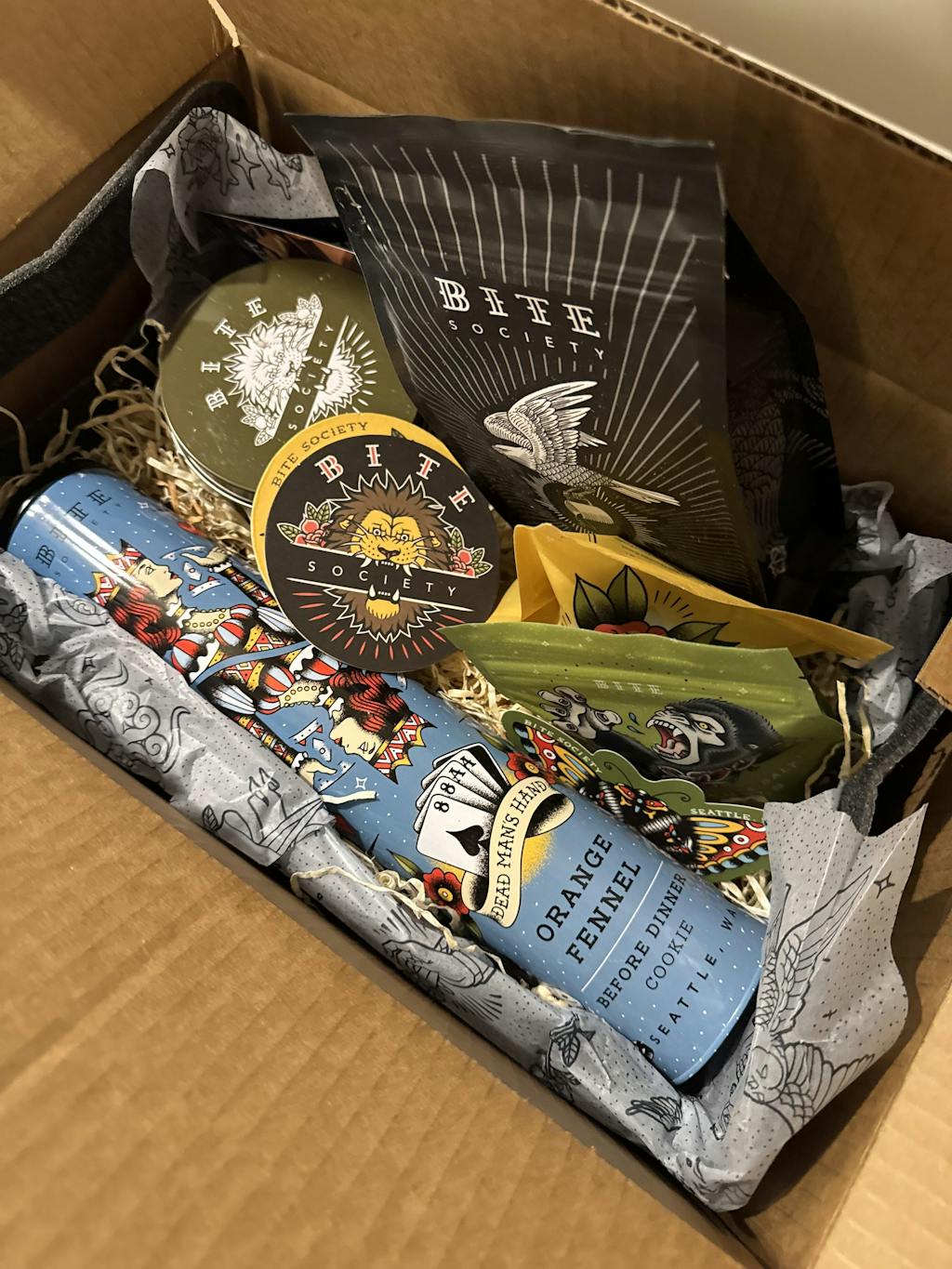 All of our baskets include your choice of our original Bite Society Cards written by hand with your message. On rare occasions, we may have to make a substitution of items in your basket.